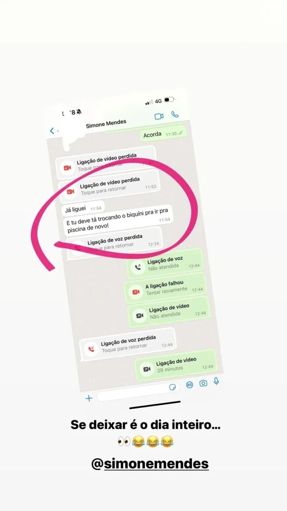 Simone, então, ligou para Maiara via chamada de vídeo, mas não foi atendida. A sertaneja então provocou via mensagem: “Tu deve estar trocando o biquíni para ir pra piscina de novo”. Maiara respondeu: “Se deixar é o dia inteiro”.