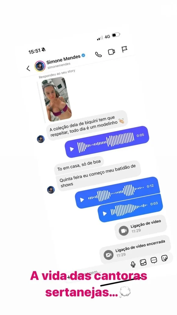 “A coleção dela de biquíni tem que respeitar, todo dia é um modelinho”, escreveu Simone para Maiara, que respondeu a amiga via mensagens de áudio. A esposa de Kaká Diniz então escreveu: “Estou em casa só de boa. Quinta-feira começa meu batidão de shows”.